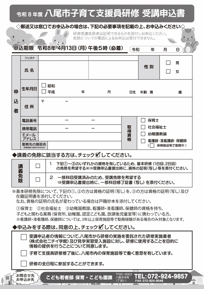 下記の受講申込書に必要事項を記入のうえ、保育・こども園課まで、郵送・窓口にてご提出ください。