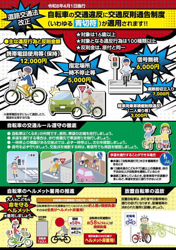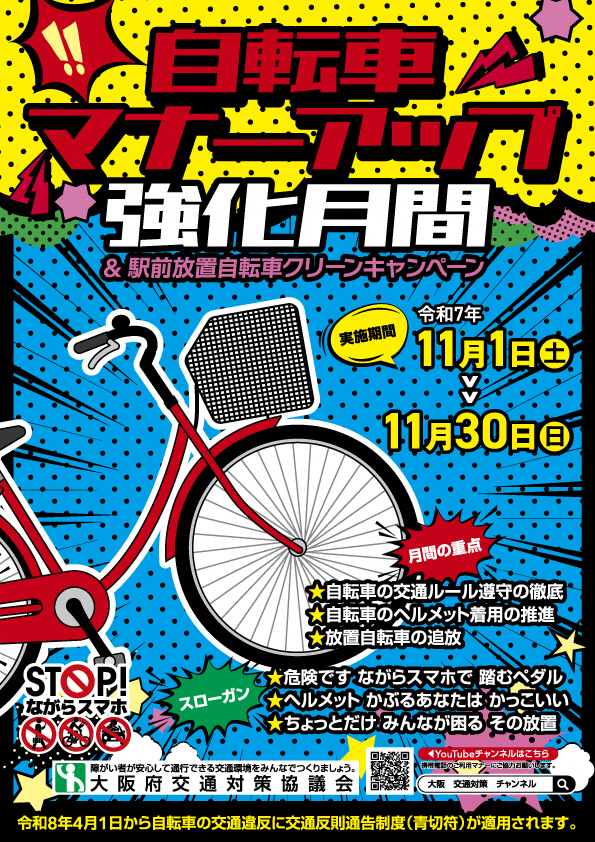 この強化月間は、広く府民に自転車利用に関する交通ルールの遵守と正しい交通マナーの実践を習慣付けることによって、自転車の安全適正利用を促進し、自転車利用者による交通事故防止の徹底を図ることを目的としています。